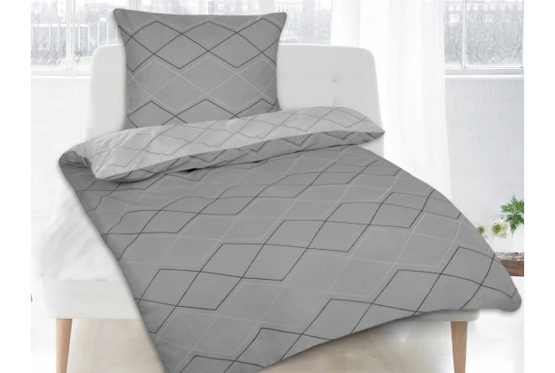 Obojstranné bavlnené obliečky s moderným geometrickým vzorom v šedej farbe dodajú Vašej spálni štýlový a elegantný vzhľad. sú vyrobené zo 100% bavlny, ktorá zaistí príjemný pocit počas spánku. Súprava zahŕňa obliečku na prikrývku s rozmermi 140×200 cm a obliečku na vankúš 70×90 cm.