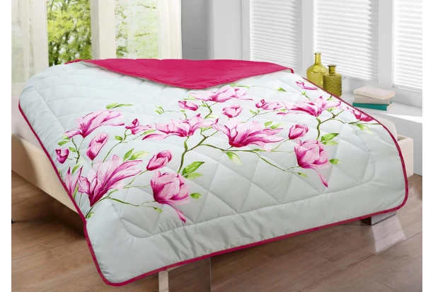 Ľahká a priedušná prešívaná prikrývka o rozmere 140×200 cm s kvetinovým vzorom magnólie je ideálna pre letné mesiace.