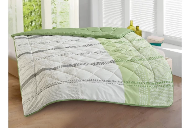 Ľahká a priedušná prešívaná prikrývka o rozmere 140×200 cm v zeleno-bielej farbe ideálna pre letné mesiace.
