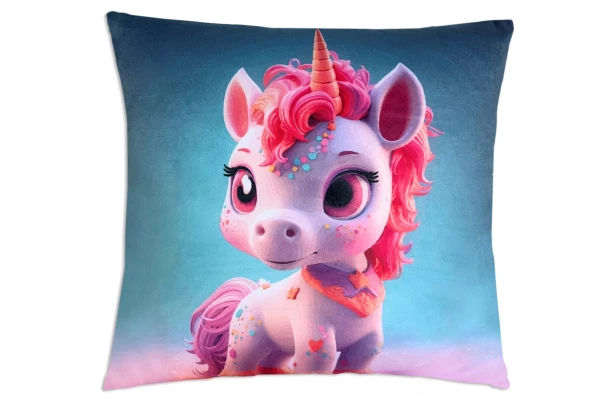 Plyšový dekoračný vankúšik s roztomilým jednorožcom premení detskú izbu na kúzelný svet. Tento zamatový vankúšik je skvelým spoločníkom pre vašich najmenších. Rozmer 35×35 cm.