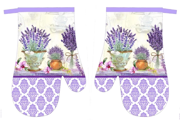 Praktická sada dvoch kuchynských rukavíc s elegantným levanduľovým motívom vo fialovej farbe spoľahlivo ochráni vaše ruky ruky pri varení aj pečení. Chňapky s rozmermi 16×27 cm sú štýlovým a užitočným doplnkom do každej kuchyne.