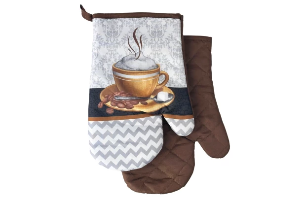Praktická sada dvoch kuchynských rukavíc s elegantným motívom kávy v hnedej farbe spoľahlivo ochráni vaše ruky pri varení aj pečení. Chňapky s rozmermi 16×27 cm sú štýlovým a užitočným doplnkom do každej kuchyne.