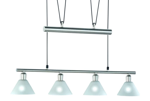 Elegantné stropné osvetlenie má tienidlá z bieleho matného skla a kovovú konštrukciu na posuvných lanách, ktoré vám umožnia nastavovať výšku osvetlenia podľa potreby.