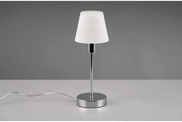 Elegantná stolná lampa má tienidlo z bieleho matného skla a kovovú konštrukciu s funkciou dotykového ovládania, s ktorou môžete ľahko meniť intenzitu svetla.