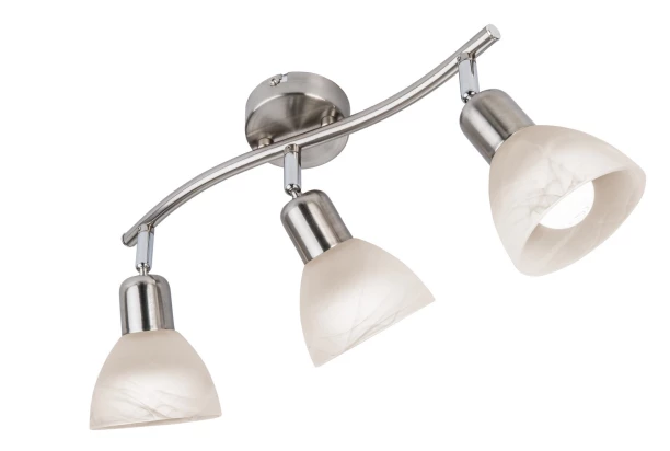 Univerzálné stropné osvetlenie zo série Daytona je vyrobené z kovu a bieleného alabastrového skla. Variant s 3 bodovými svietidlami na polohovateľnom kĺbe.