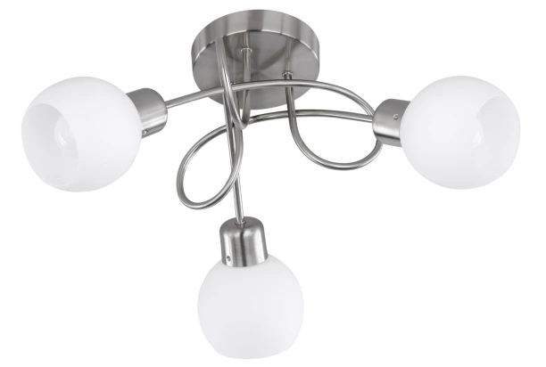 Stropné osvetlenie s úspornou LED technológiou vytvára príjemné svetelné akcenty a dodáva obytnému priestoru útulnú atmosféru. Osvetlenie zaujme svojim jednoduchým dizajnom v prevedení matný nikel, ktorý perfektne ladí s opálovo bielymi sklenenými tienidlami. Variant s 3 svietidlami.