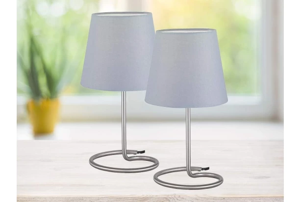 Stolná lampička v sete obsahuje 2 kusy. Jednoduchý dizajn stolových lámp, kombinuje elegantná kovová konštrukcia a šedé látkové tienidlo. Tieto lampičky, veľmi dobre zapadnú do akéhokoľvek štýlu bývania a poslúži nielen na nočné stolíky, ale aj ako skvelý doplnok políc, komôd alebo malých stolov.