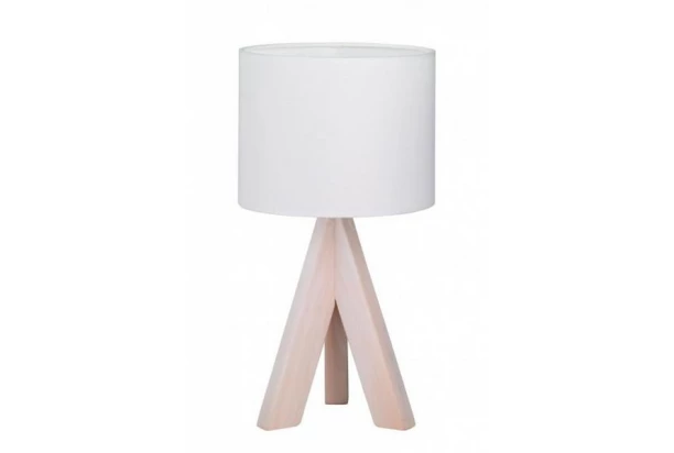 Štýlová stolná lampa má biely odtieň a výrazné drevené nohy z bielej farby.