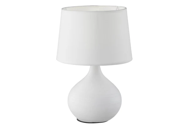 Elegantná stolná lampa v bielej farbe má keramickú základňu a látkové tienidlo. Lampička poskytne príjemné osvetlenie nielen v spálni, ale aj v obývacej alebo detskej izbe. Výška 29 cm.