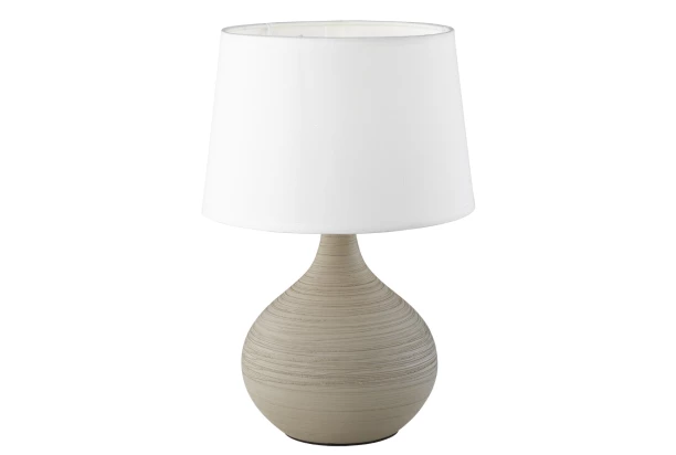 Elegantná stolná lampa s keramickou béžovou základňou a látkovým tienidlom v bielej farbe poskytne príjemné osvetlenie nielen v spálni, ale aj v obývacej alebo detskej izbe.