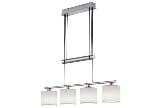 Stropné závesné osvetlenie so 4 svietidlami je praktickým aj dekoratívnym bytovým doplnkom. Kovová konštrukcia v prevedení matný nikel dokonale ladí s látkovými tienidlami v bielej farbe. Vďaka výškovej nastaviteľnosti je možné prispôsobiť svetlo Vašim potrebám a je možné ho umiestniť nad jedálenský alebo barový stôl.