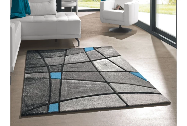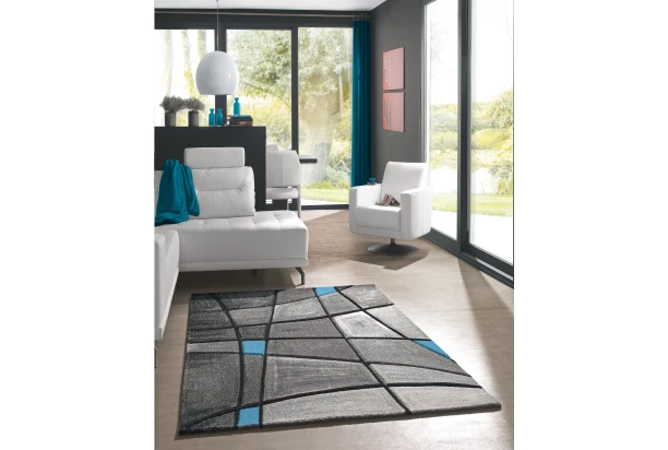 Krásny koberec s pôsobivým geometrickým vzorom. Farba sivá/čierna/tyrkysová. Rozmer 160×230 cm.