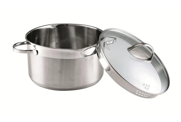 - oceníte najmä inovatívnu a funkčnú pokrievku, ktorá má na svojom okraji špeciálne dierovanie, ktoré nielen odvádza z hrnca paru, ale tiež spoločne s výlevkou hrnca funguje ako veľmi komfortný cedník a výlevka vody zároveň (na okraji pokrievky 2 rôzne veľké typy dierovania podľa druhu pripravovaného jedla – stači pokrievku iba pootočiť podľa aktuálnej potreby a ľahko zcediť)