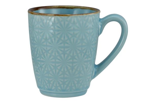Hrnček s objemom 300 ml vo svetlo modrej farbe s jemným vzorom je vyrobený z kvalitnej kameniny. Hrnček zaujme svojím retro štýlom a bude ideálnym doplnkom pre každodenné pitie kávy alebo čaju.