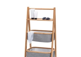 Bambusový regál s textilnými košíkmi v elegantnej šedej pozdvihne dizajn kúpeľne, domáceho wellness alebo miesta odpočinku po saunovaní. Košíky sa výborne hodia na kozmetiku, knihu či časopis. Na hornej odkladacej ploche sa zas bude skvele vynímať orosený nápoj.