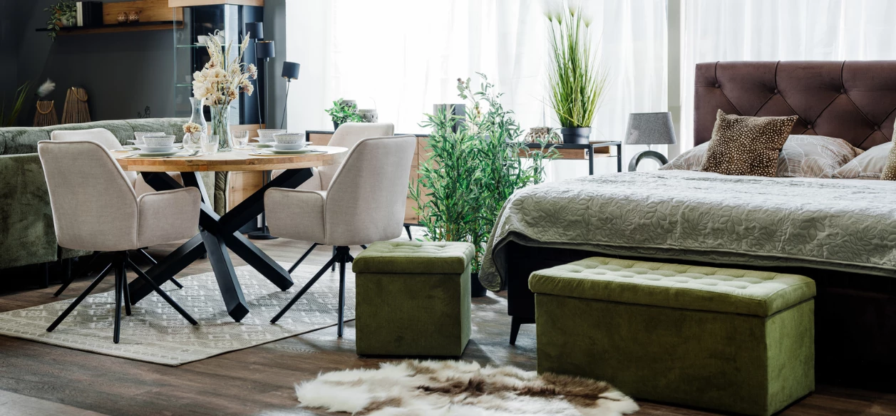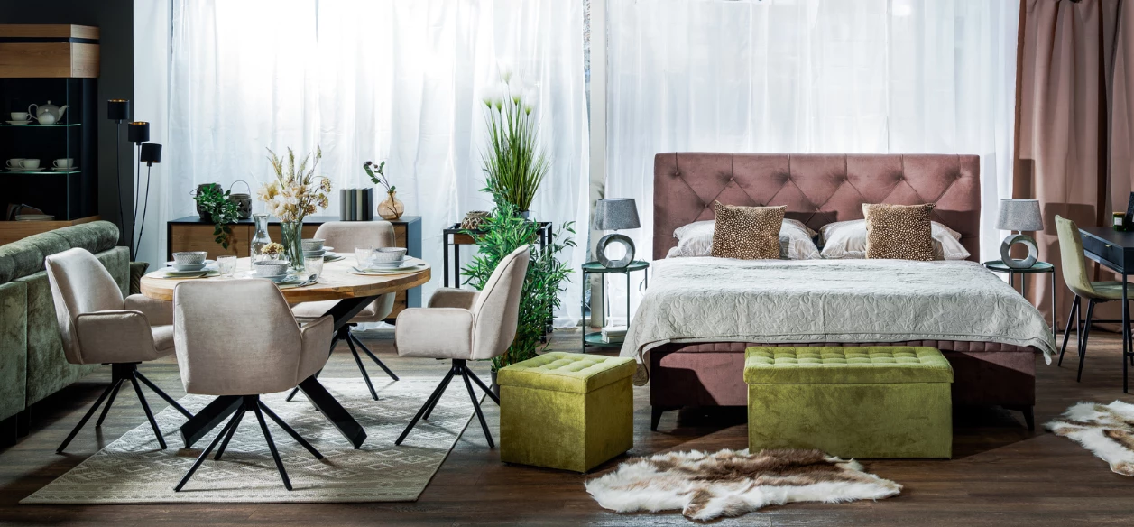 Ak v rôznych zónach máte nábytok s odlišným dizajnom, správne vybraté textílie pomôžu nesúrodý interiér zjednotiť. V našom prípade sa štruktúra zamatovo hebkej tkaniny prelína celou expozíciou. Objavuje sa v rôznych farbách na pohovke, dekoračných vankúšoch, jedálenských stoličkách a čalúnenej posteli.