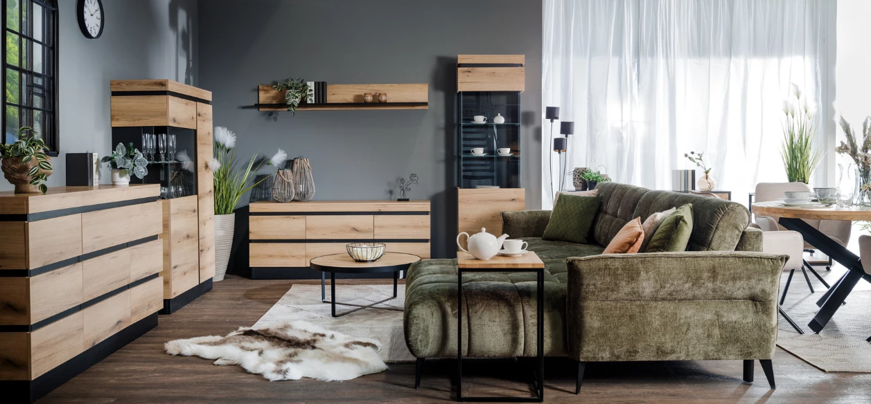 Podľa interiérovej dizajnérky Andrey Čučky je potrebné začať rozdelením priestoru na jednotlivé zóny a ich vizuálnym oddelením. „Jedným zo spôsobov, ako oddeliť obývaciu zónu od ostatných, je umiestnenie pohovky,“ hovorí Andrea Čučka. Tento jednoduchý trik umožňuje vytvoriť prirodzený predel napríklad medzi jedálenskou a obývacou časťou bez toho, aby ste museli inštalovať priečky či iné bariéry. Otočením pohovky do priestoru vytvoríte „neviditeľné“ rozhranie medzi týmito dvoma zónami, pričom obe zostanú otvorené a vzdušné. Odpočinkovú zónu rámujú komody, vitríny a police z programu Corte v prírodnom dekore dubu coast. Poskytujú dostatok úložného priestoru a vďaka kombinácii presklených a uzavretých políc je v nich miesto aj na obľúbené umelecké predmety, ktoré chcete mať na očiach.