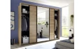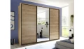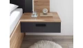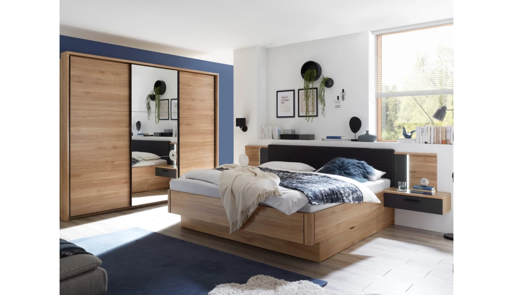 Kolekcia nábytku Aschau/Bravo – vyrobená v útulnom drevodekore dub mauvella v kombinácii s grafitovou farbou, pre modernú a zároveň útulne zariadenú spálňu. Čelo postele má štýlové látkové polstrovanie a pôsobivé LED nasvietenie, ktoré dotvára príjemnú večernú atmosféru v spálni. Zavesené nočné stolíky sú súčasťou zadného čela a pôsobia tak vzdušným dojmom – údržba podlahy pod nimi je navyše aj jednoduchšia. Oceníte aj bočné úložné zásuvky, do ktorých ľahko uložíte posteľnú bielizeň, lôžkoviny, deky alebo napríklad veci sezónnej potreby. Praktická komoda obsahuje kombináciu dverí a zásuviek na prehľadné ukladanie rôznych vecí. Veľká šatníková skriňa so zrkadlom má celkovú šírku 270 cm. Za jej posuvnými dverami nájdete priestranné úložné priestory so šatníkovými tyčami a hornými policami. Bočnú konštrukciu skrine je možné navyše doplniť okrasným paspartovým rámom.