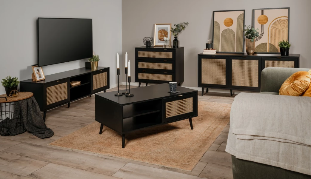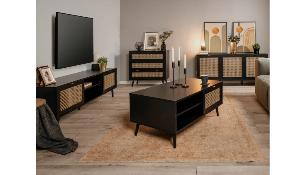 Kolekcia Vienna – elegantný nábytok v čiernom prevedení v kombinácii s imitáciou prírodného viedenského výpletu zaujme na pohľad a skvele doplní váš štýlový interiér. Masívne čierne nôžky dotvárajú elegantný vzhľad a zároveň umožňujú jednoduchú údržbu podlahy. Objavte tak kúzlo nábytku s tradičným nádychom, ktorý pôsobí útulne, veľmi štýlovo a zároveň zostáva praktický. Z jednolivých elementov tak môžete krásne zariadiť priestor celého bytu. Tento nábytok sa dobre kombinuje aj s prírodnými doplnkami, navyše úžasne doplní aj moderný interiér, kde vynikne a stane sa zaujímavým vizuálnym prvkom.