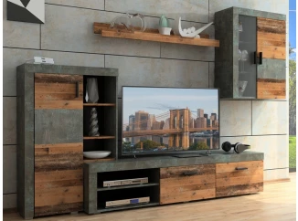 Obývacia stena Pico, tmavý betón/vintage optika dreva, s osvetlením